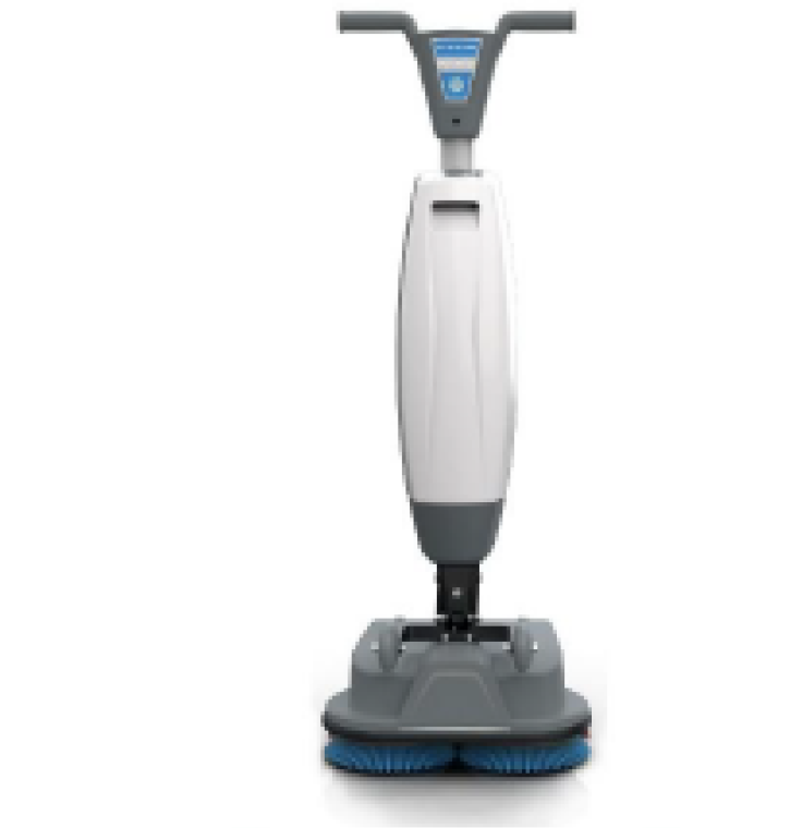 Uses a disc brush and squeegee to wash floors and collect dust and liquids while moving forward.